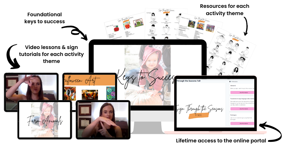 Everything you need is kept in your membership portal. Everything is digital; nothing will be mailed or shipped to you. You will learn the keys to success and 3 techniques to use with sign language. There are 4 seasonal themes (fall, apples, Halloween, and farm animals) that include book recommendations, ASL signs, and activity ideas. Your resources include a materials list for each theme for easy planning & prep!